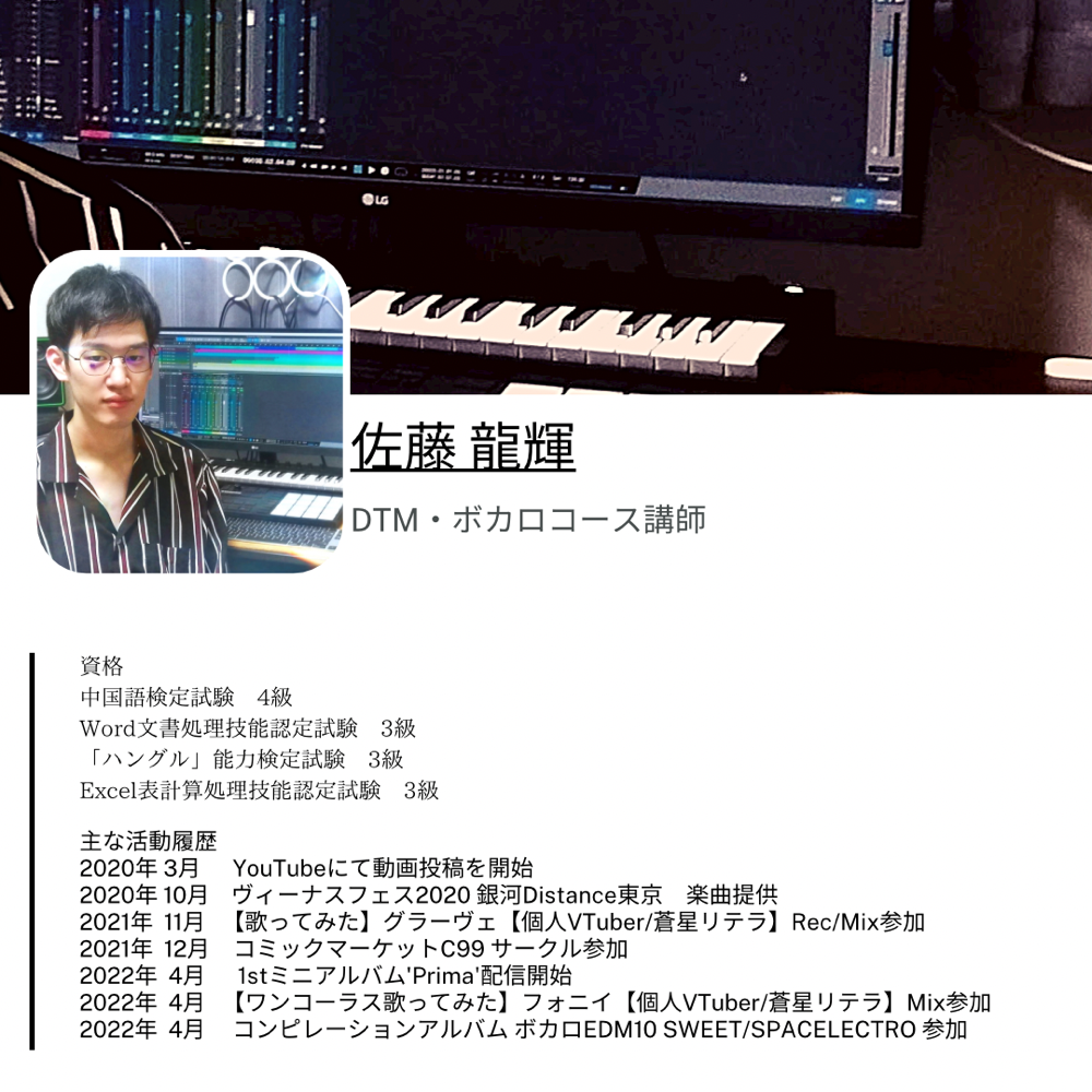 機材や楽曲制作の手順、DAWソフトを使った打ち込みやレコーディング、またVocaloid(ボーカロイド)を用いたレッスンなどを行い、初心者でも丁寧に安心して受講していただけるレッスンです。